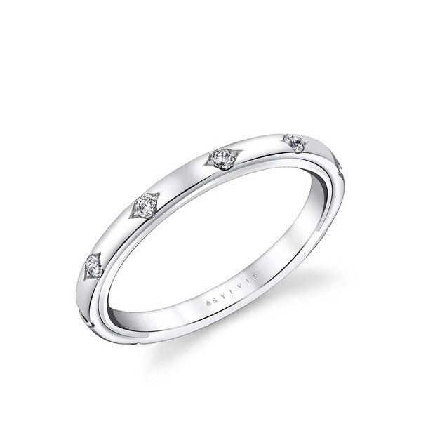 This two tone flush set wedding ring is the matching wedding band for the S5025 and features our signature Shell Iconelle Inlay in rich yellow gold, accented on the band by round diamonds, totaling 0.14 carats, set flush with Shell...